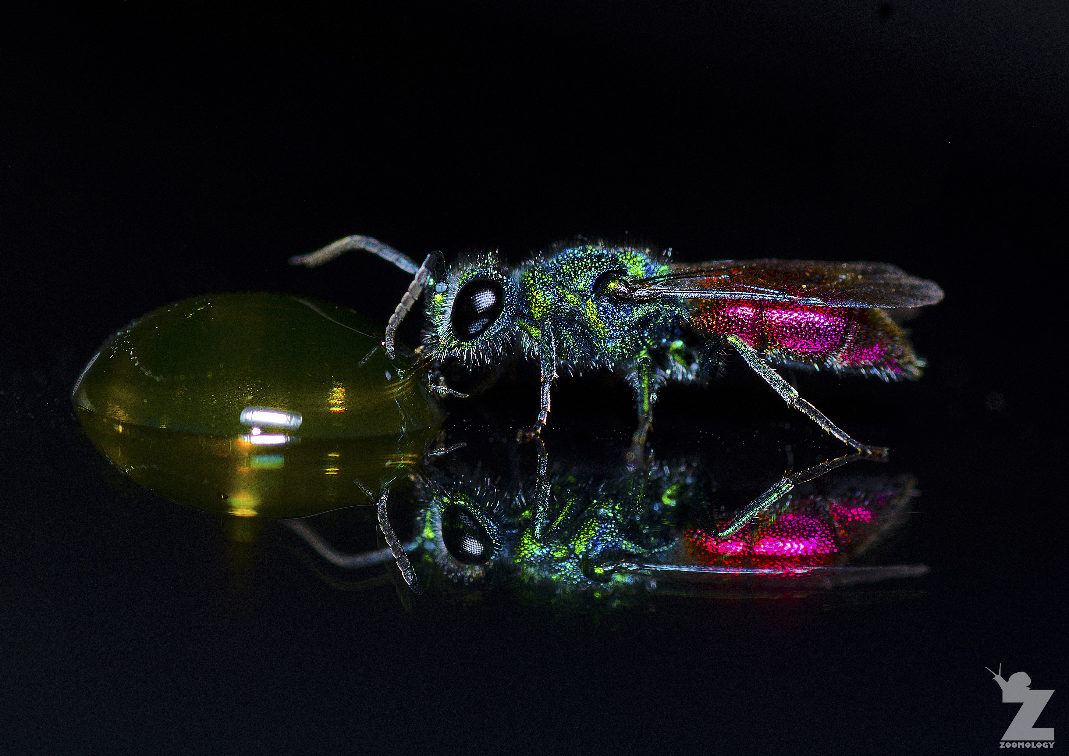 This tiny (5mm) wasp was remarkably spotted by my partner, Emma, at some distance glinting in the sunlight. To capture this image, I coaxed the wasp onto the screen of my mobile phone using a droplet of maple syrup. This provided the reflection in the resulting image.